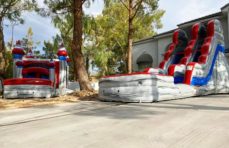 Las Vegas Party Service and Giant Inflatable Water Slide rental company, Slide into Vegas presents, the Master Blaster Giant Water Slide. Fear of heights? Face your fears & climb the ladder to plunge down the Master Blaster - PERFECT for your next Patriotic or Super hero party and EVERY Las Vegas in between! This popular slide gives you more affordable family fun and THRILL for your budget, great for accommodating smaller spaces while still featuring our signature water slide with oversized pool for safety. Slide into Vegas prides it self in always bringing you on time guaranteed, while staying the most affordable Water slide company licensed and insured in Las Vegas, North Las Vegas, Summerlin, Centennial, Aliante, Mountains Edge, Nellis Air Force Base and Henderson.