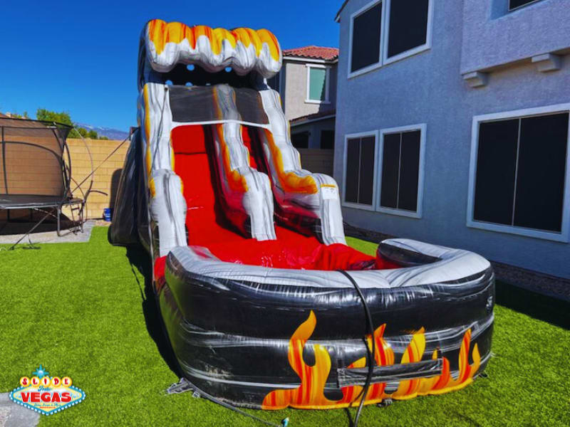 Experience the thrill of the Flamin' Hot Wheels Water Slide, a 15-foot giant slide that brings the excitement of Las Vegas right to your backyard!