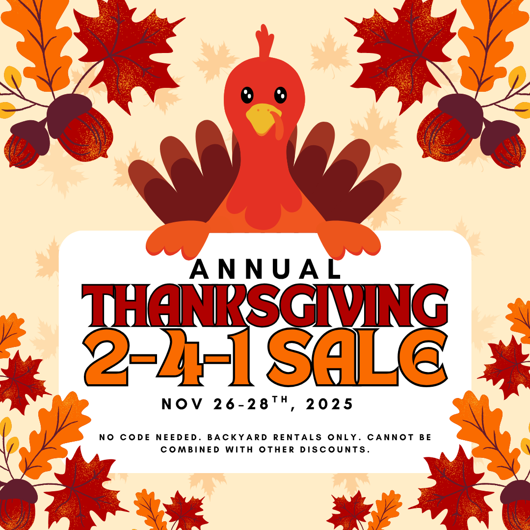 TO RESERVE THANKSGIVING DISCOUNT: Call, Text, Email OR Book online! Simply reserve 11/27/2025 and we'll automatically upgrade you to 11/26-11/28/2025. Delivery will be scheduled between 7:00am-12:00pm on 11/26/2025. Pick up will be scheduled for 7:00am-12:00pm on 11/28/2025. Must be in backyard OR fully fenced area. Cannot be combined with other offers. Ask about our 3 day specials!
